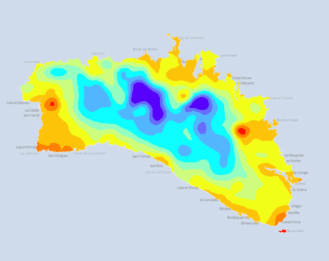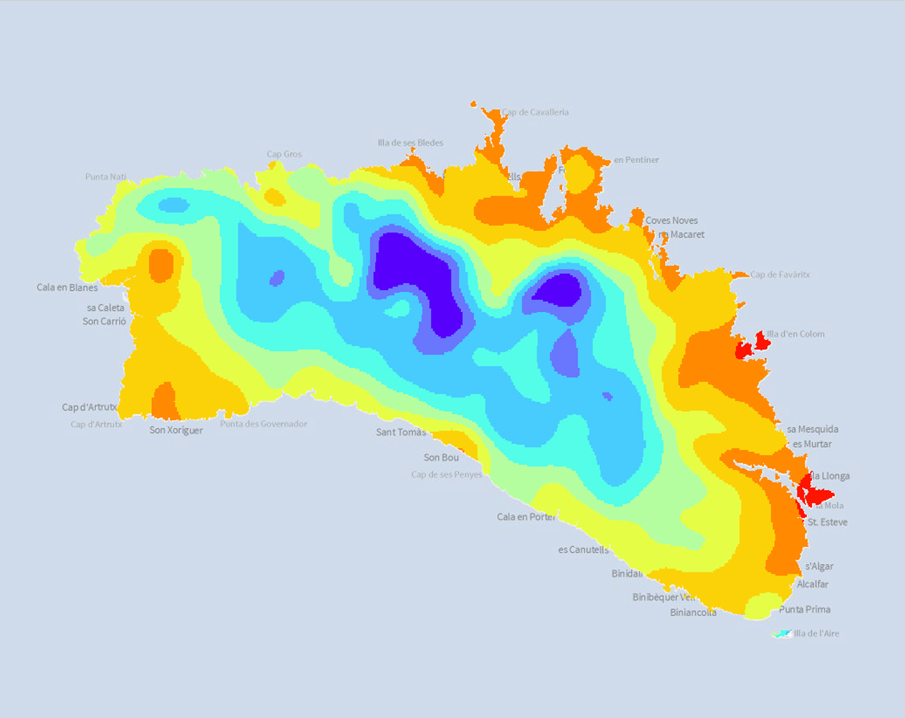 Mapa climàtic de la temperatura màxima anual. El mapa s'ha elaborat a partir de la interpolació de les dades de temperatura de nou estacions meteorològiques de Menorca entre els anys 1950-2008. La capa s'ha elaborat en el marc del projecte LIFE+ BOSCOS