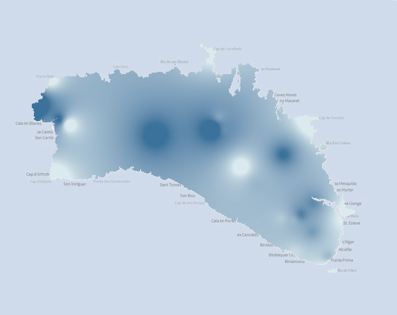 Mapa climàtic de la precipitació acumulada anual. El mapa s'ha elaborat a partir de la interpolació de les dades de pluviometria de vint i cinc estacions meteorològiques de Menorca entre els anys 1950-2008. La capa s'ha elaborat en el marc del projecte LIFE+ BOSCOS
