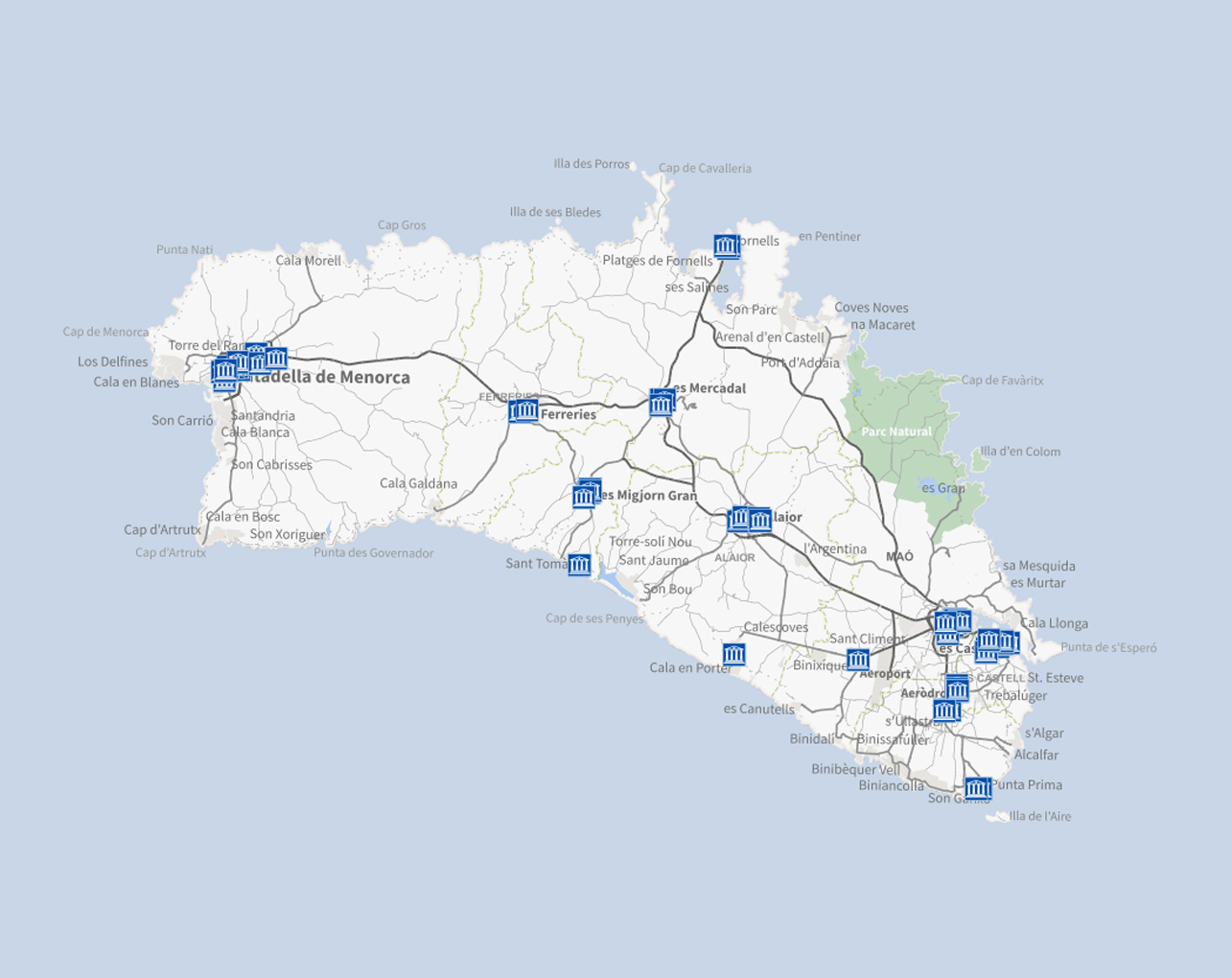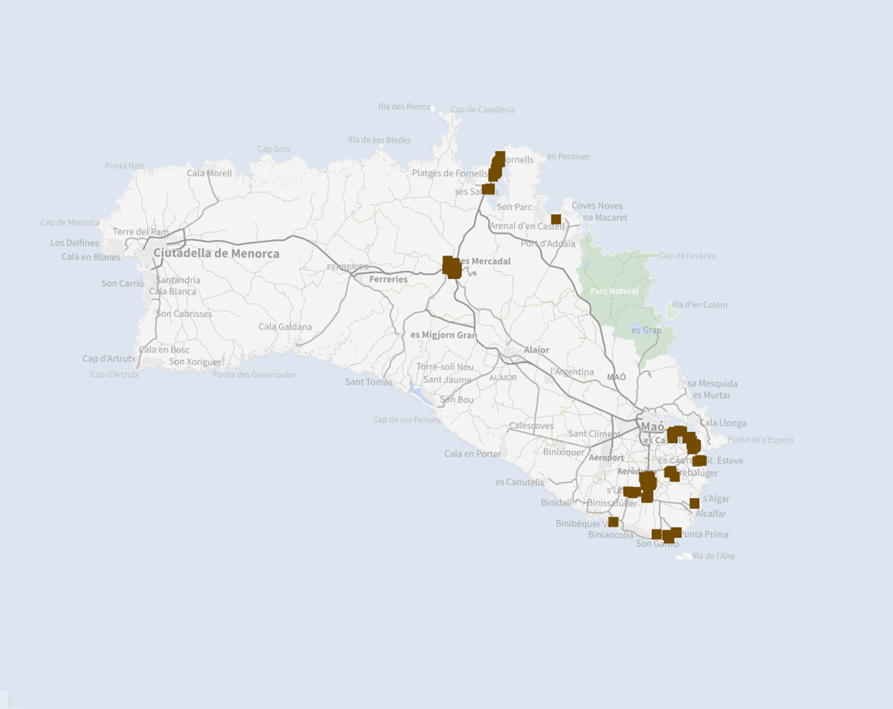 Ubicació dels contenidors de recollida de materia orgànica. La capa està vinculada a les aplicacionos de gestió del Consorci de Residus de Menorca.