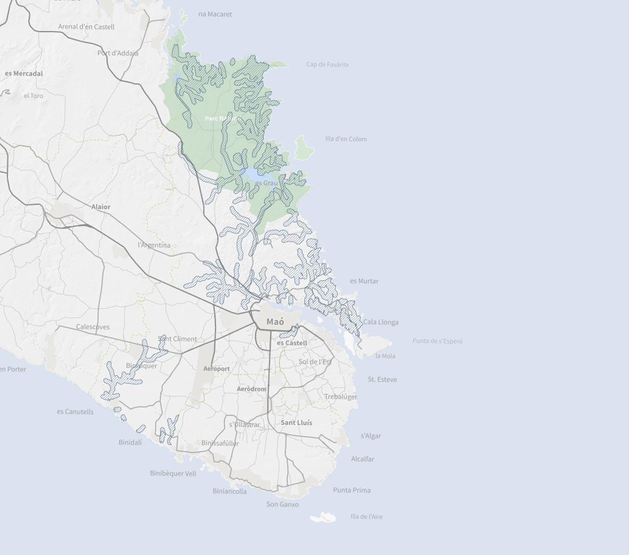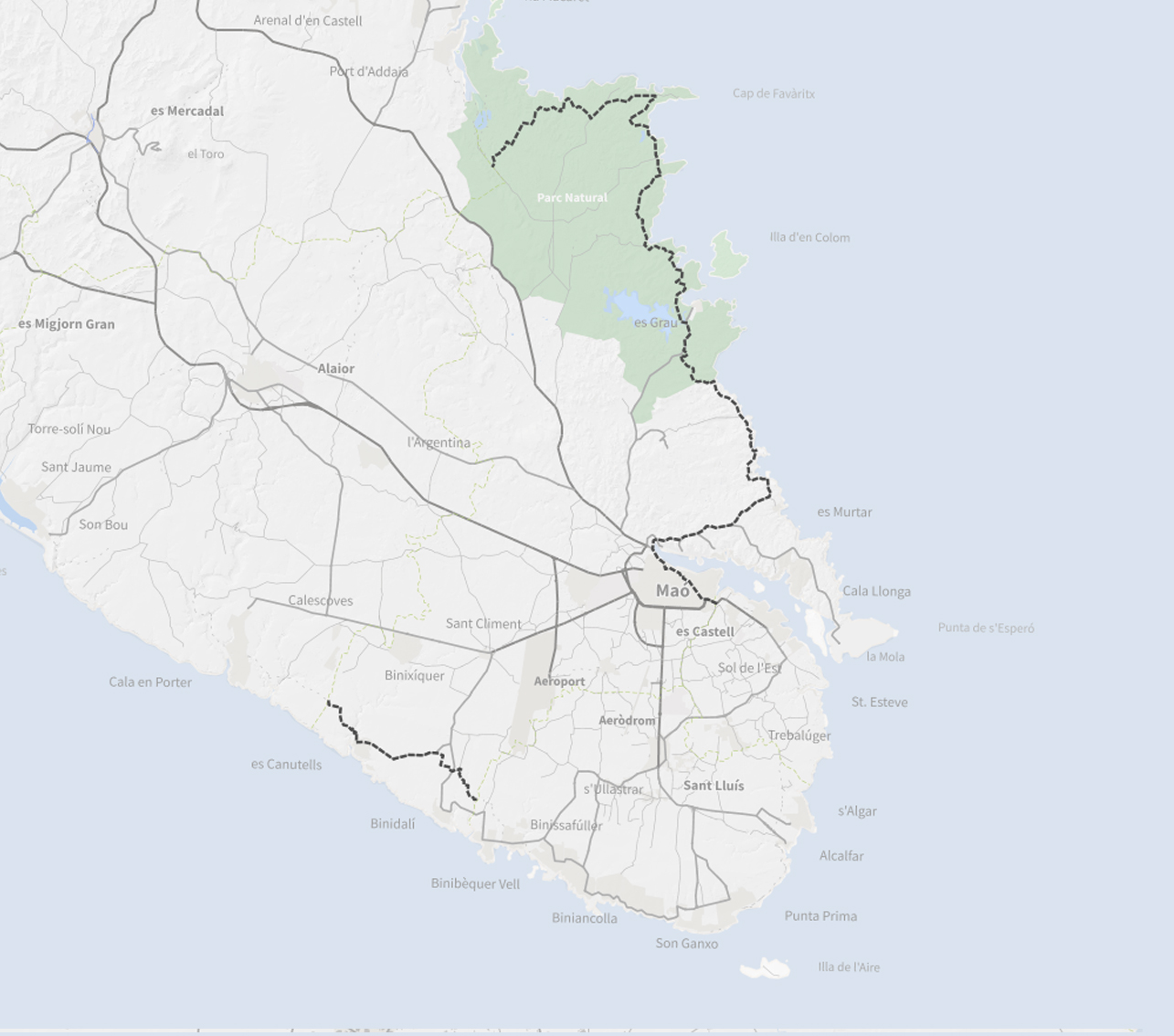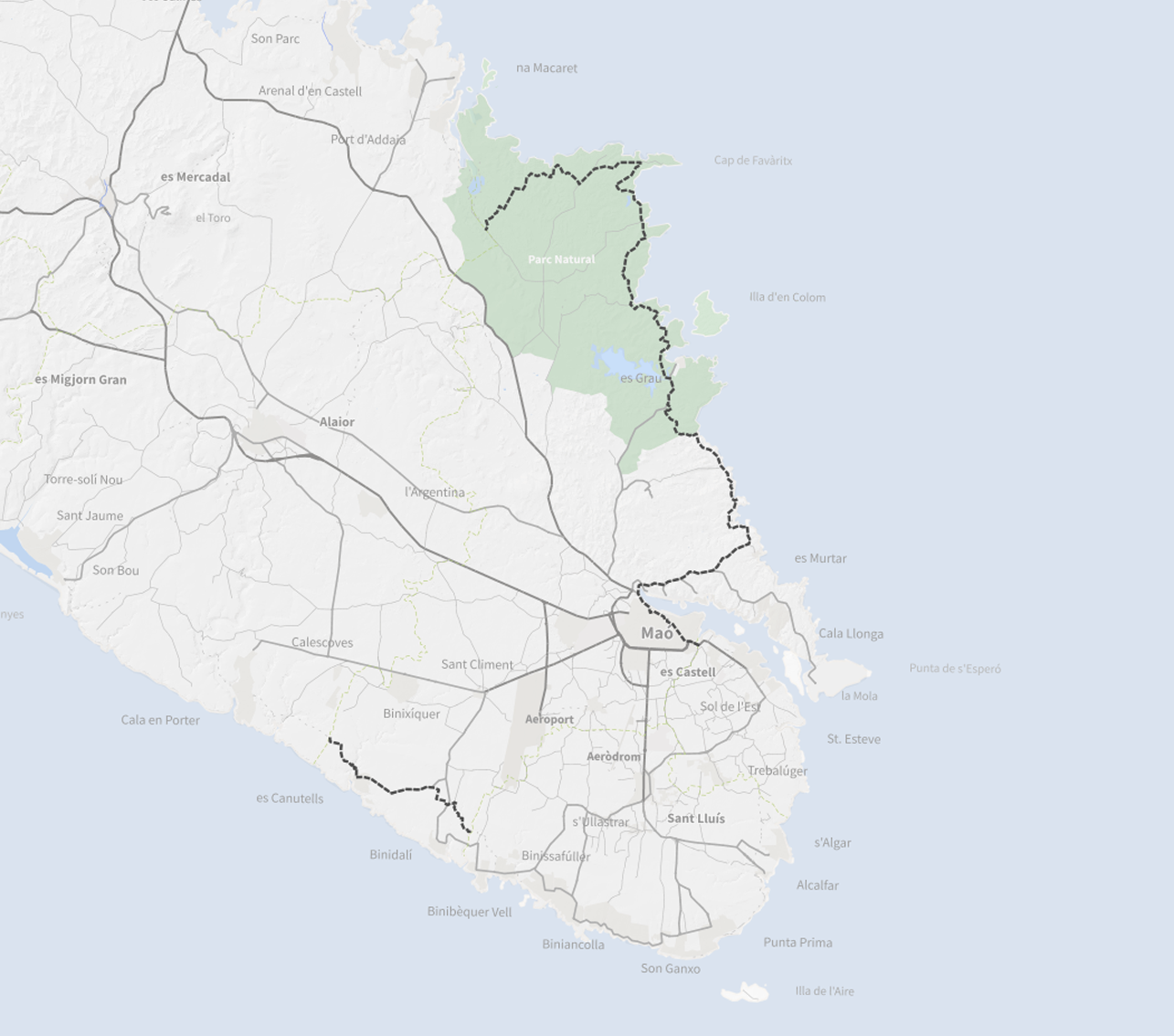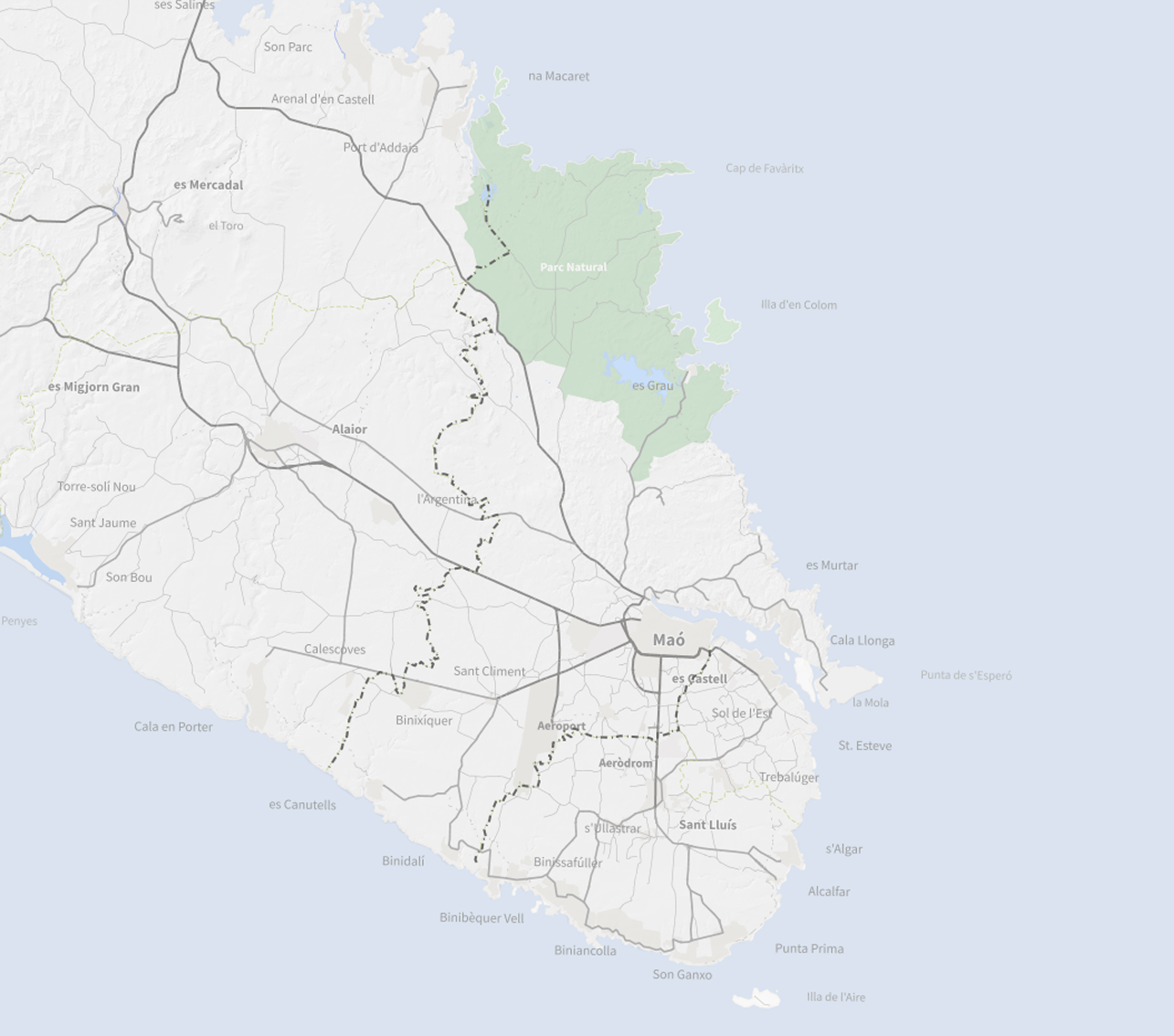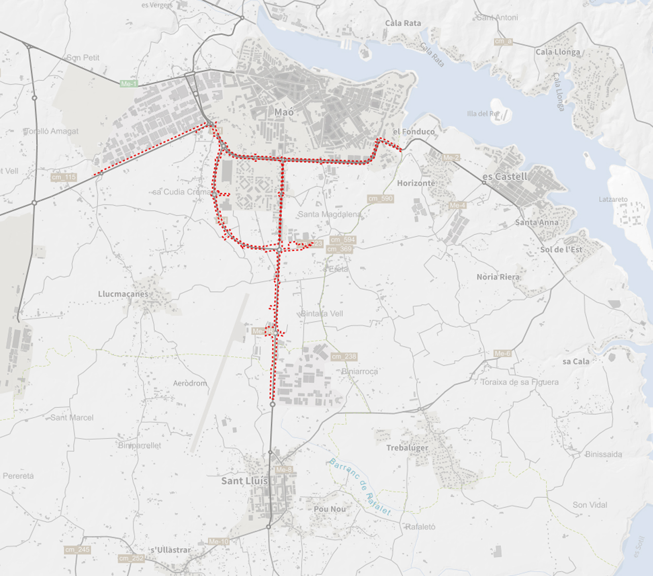 Domini Públic de Carreteres. Aquesta capa correspon a la sèrie "Ordenació del Sòl Rústic" del Pla General d'Ordenació Urbana de Maó. Cada sèrie es representa amb una simbologia diferent.
