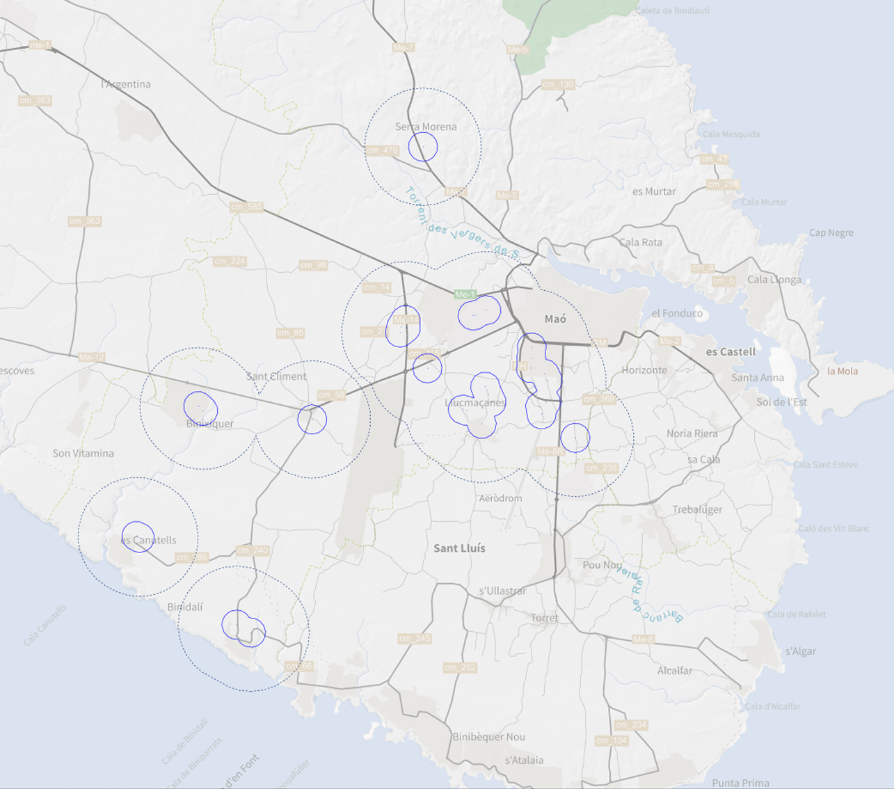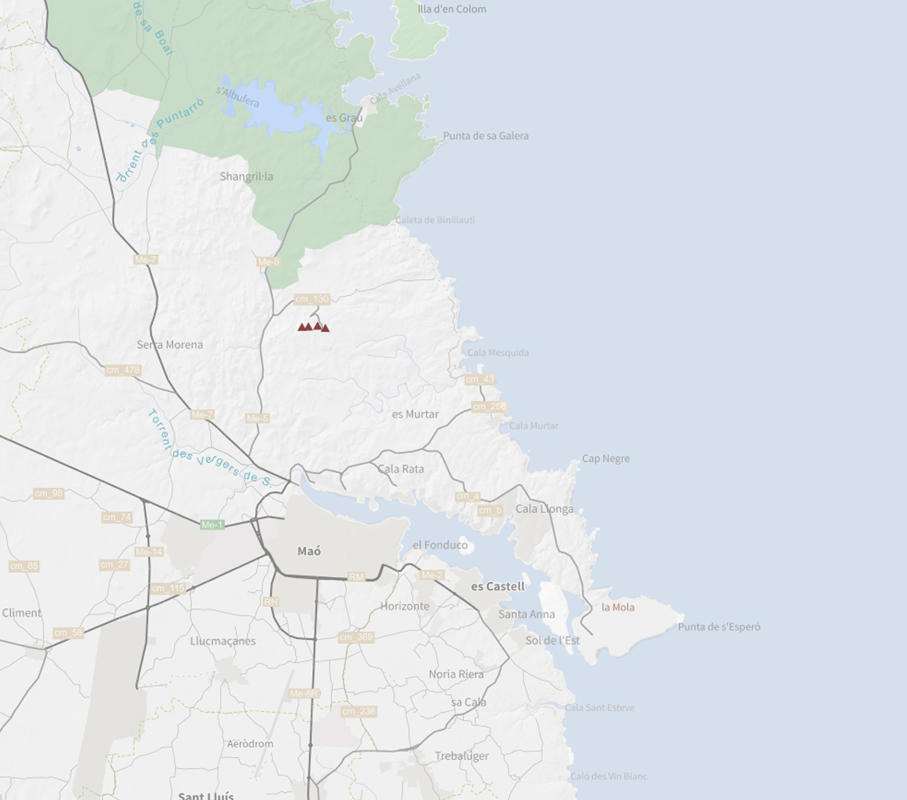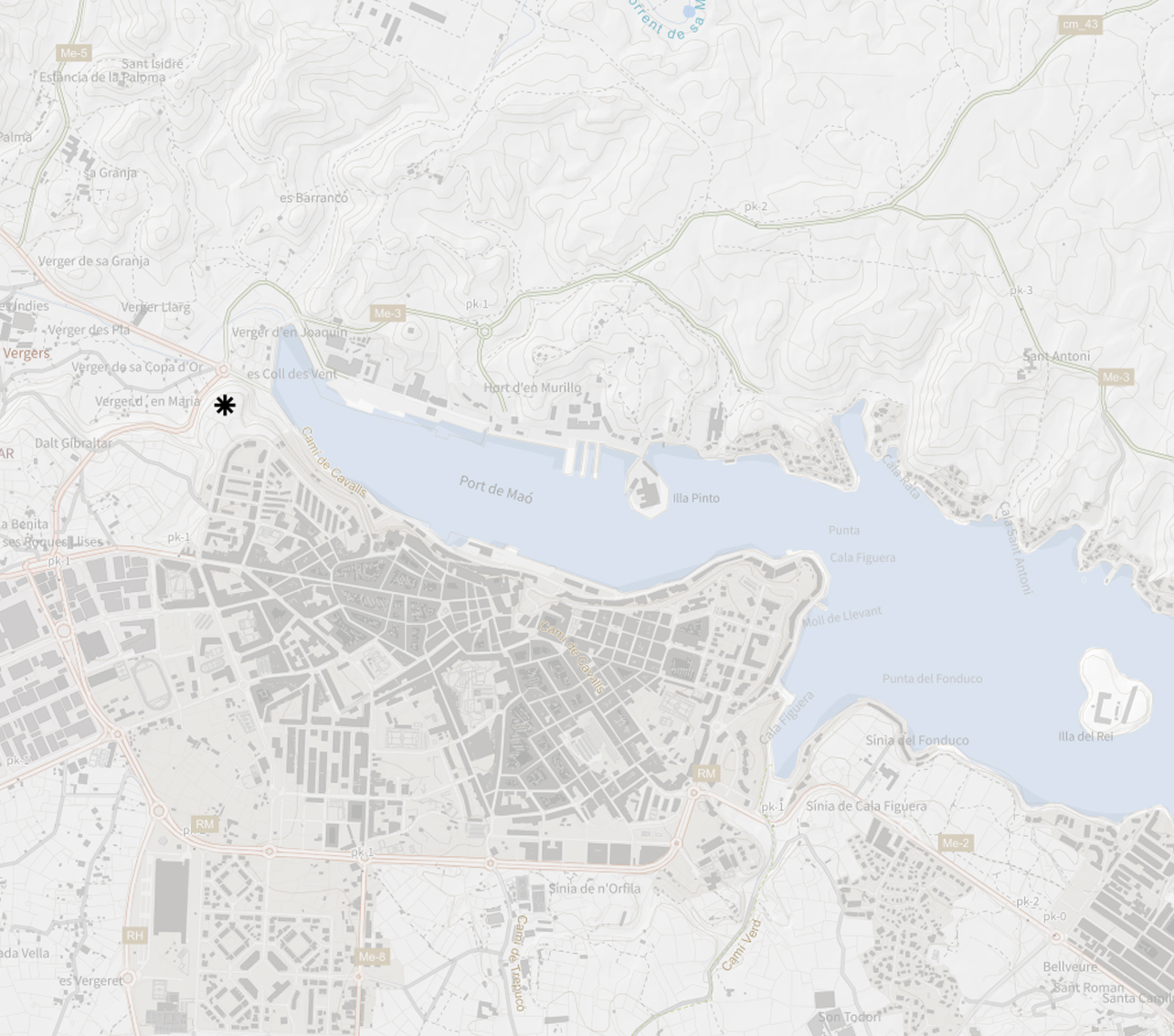 Localització del Parc Eòlic de Milà amb la ubicació dels 4 aerogeneradors existents per la producció d'energia eòlica. Aquesta capa correspon a la sèrie "Estructura General i Orgànica del Territori" del Pla General d'Ordenació Urbana de Maó.