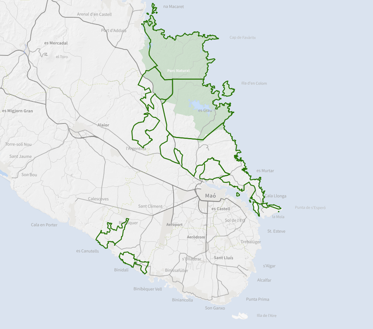 Delimitació de les Àrees Naturals d'Especial Interès . Aquesta capa correspon a la sèries "Ordenació del Sòl Rústic" i " Xarxa Natura 2000" del Pla General d'Ordenació Urbana de Maó.La capa inclou les determinacions gràfiques dels terrenys que pels seus singulars valors naturals es declaren com a Àrees Naturals d’Especial Interès per la Llei 1/1991, de 30 de gener, d’espais naturals i de règim urbanístic de les àrees d’especial protecció de les Illes Balears. Els espais declarats per la Llei 1/1991 com àrees naturals d’especial interès que afecten (parcialment o en la seva totalitat) al municipi de Maó són els següents: · ANEI Me-6: D’Addaia a S’Albufera. · ANEI Me-7: S’Albufera d’Es Grau. · ANEI Me-8: De s’Albufera a La Mola. · ANEI Me-11: De Biniparratx a Llucalari. · ANEI Me-19: Penyes d’Egipte