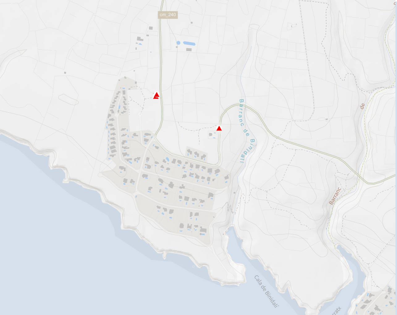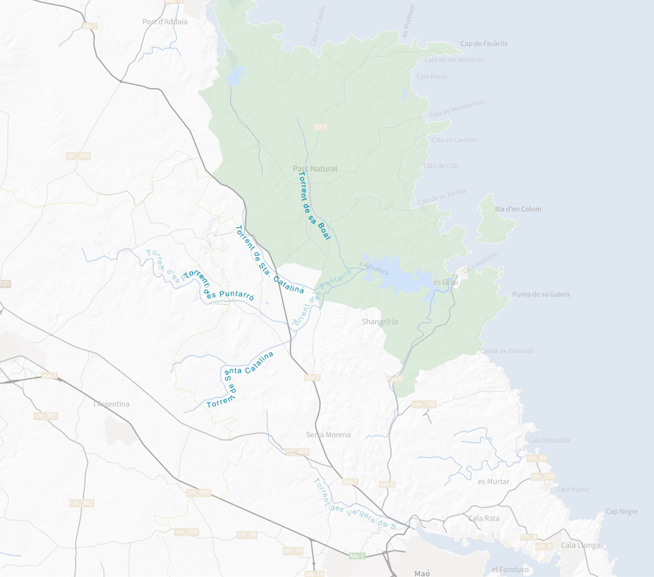Torrents de Menorca 1:5000. Aquesta capa s'ha creat a partir de la digitalització sobre l'ortofoto de 2007 dels principals torrents de Menorca. S'ha creat per ser utlitizada com a base de referència de la IDE Menorca.