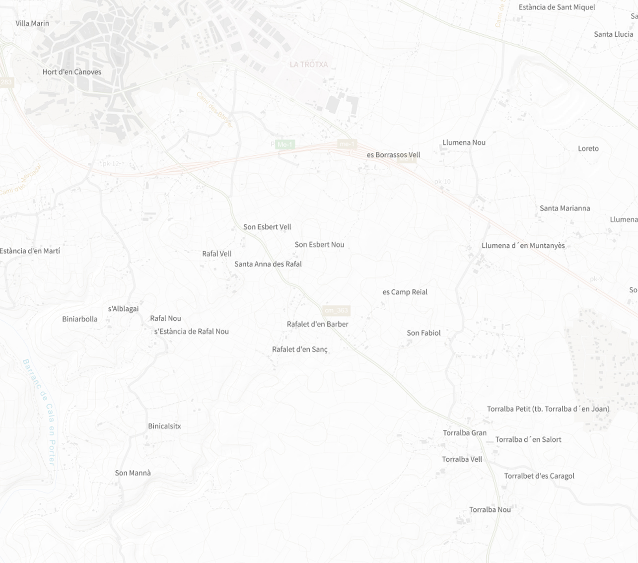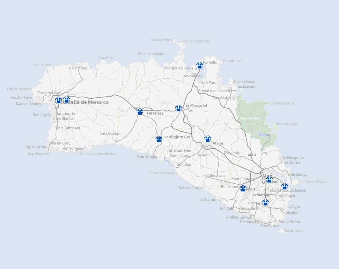 Localització del les cases de camp (llocs) de Menorca. La capa s'ha creat a partir de la digitalització damunt l'ortofoto 1:5000 de 2007 i està en constant revisió i manteniment per part dels serveis tècnics del Consell Insular.