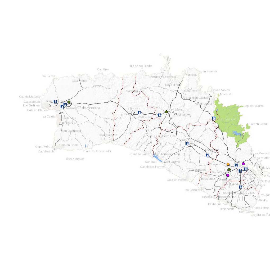 Parades principals d'autobús (bus) definits en el pla territorial insular de Menorca (PTI). La capa forma part de la sèrie de 'Sistema d'assentaments, equipaments i infraestructures' dels mapes d'ordenació PTI.