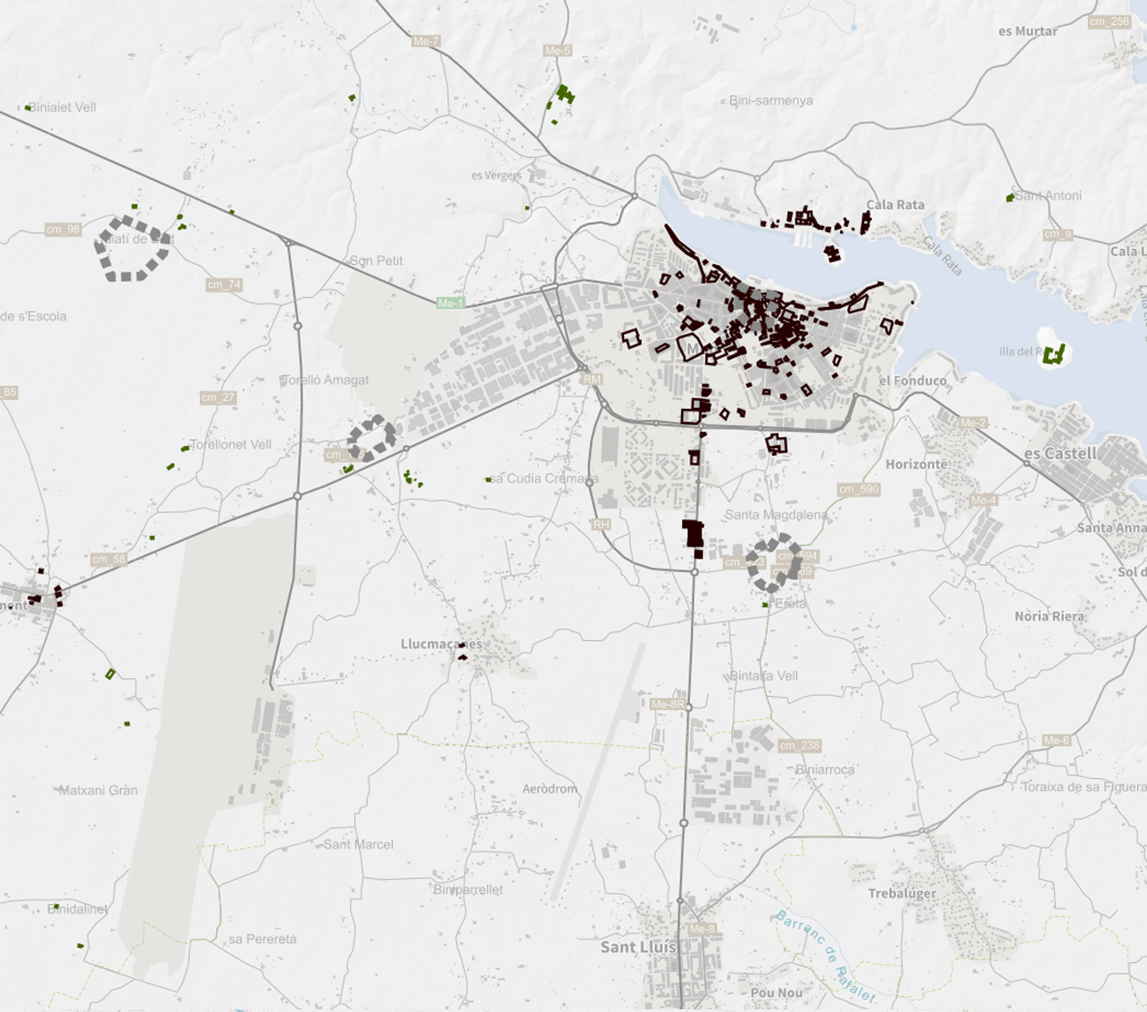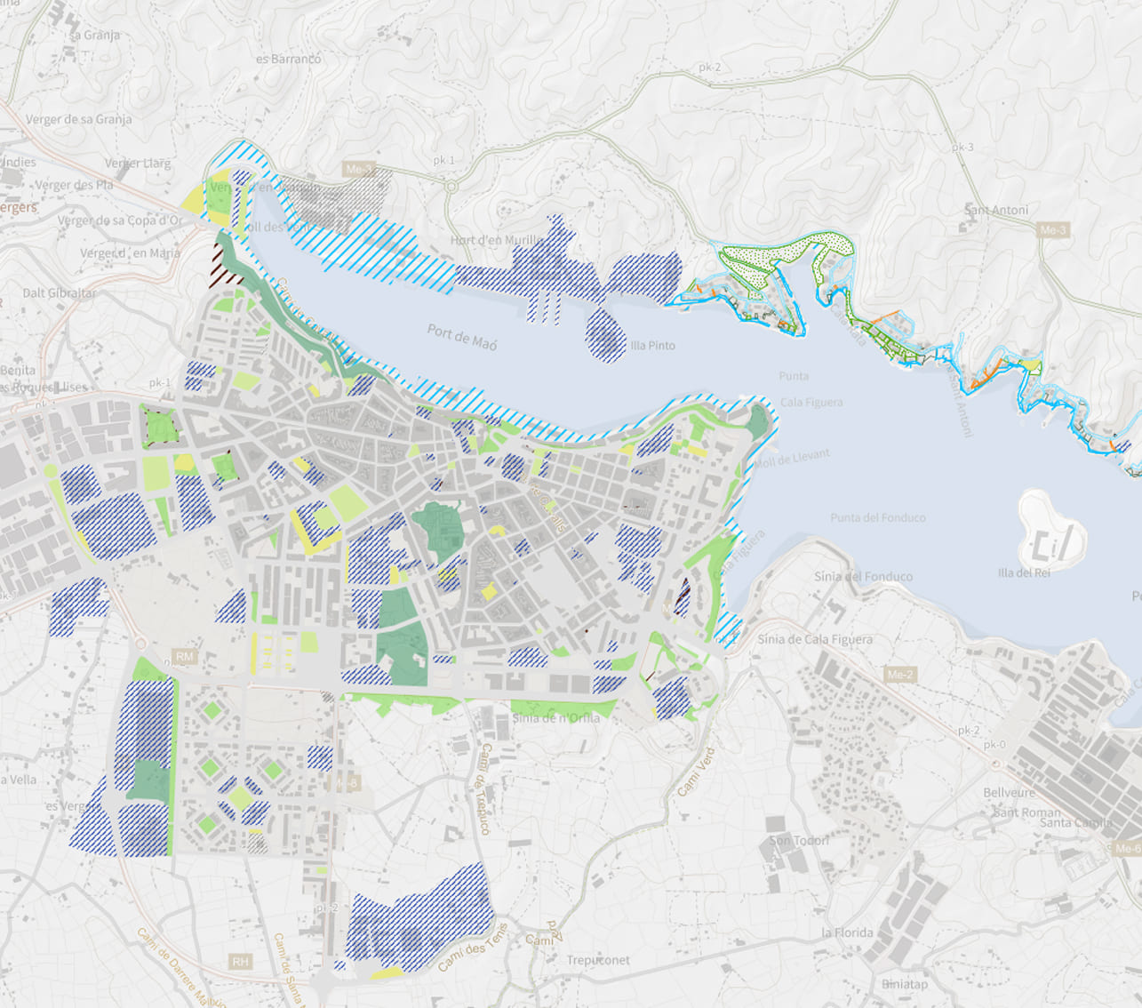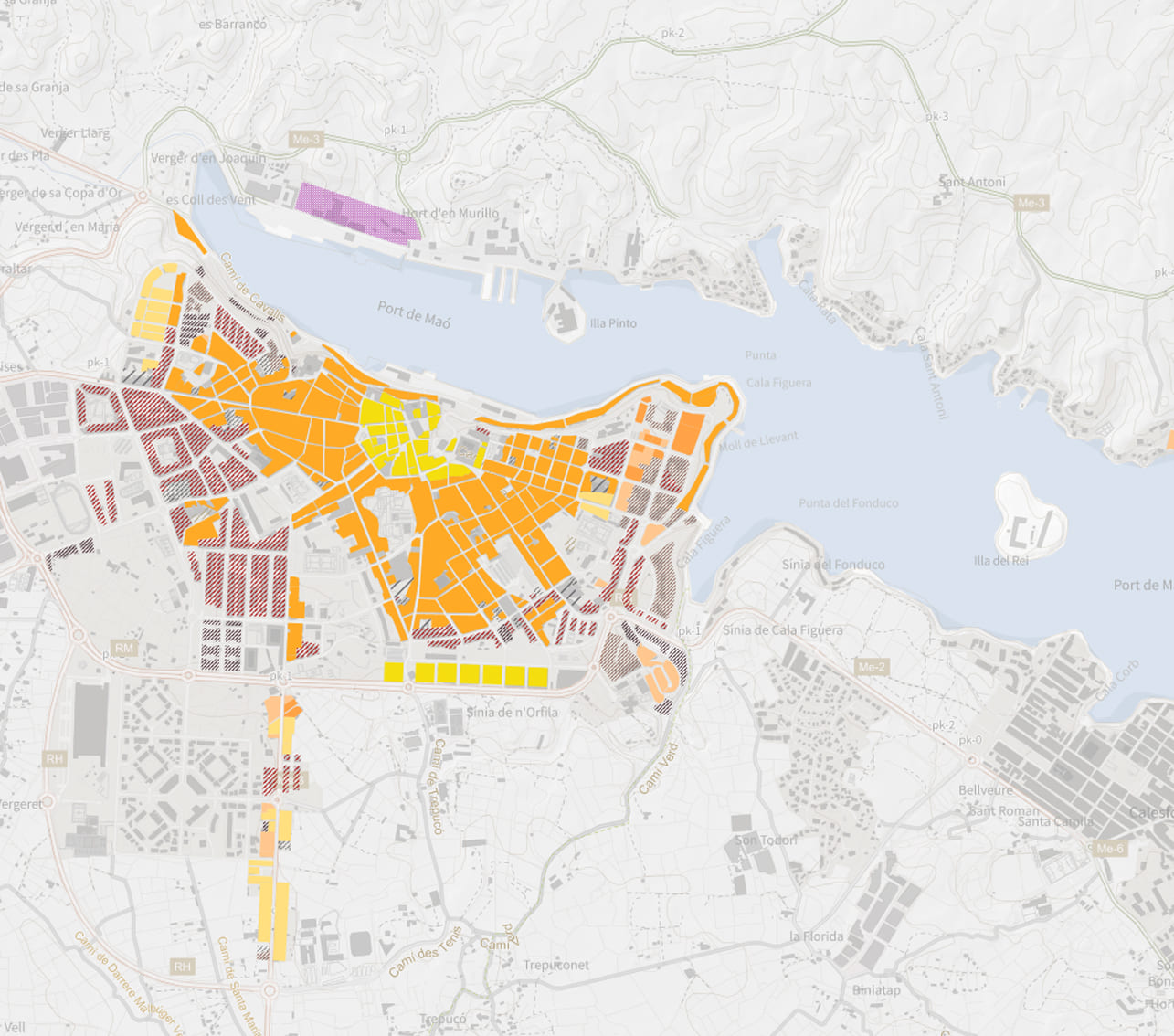 Domini Públic de Carreteres. Aquesta capa correspon a la sèrie "Ordenació en Sòl Urbà" del Pla general d'Ordenació Urbana de Maó. Cada sèrie es representa amb una simbologia diferent.
