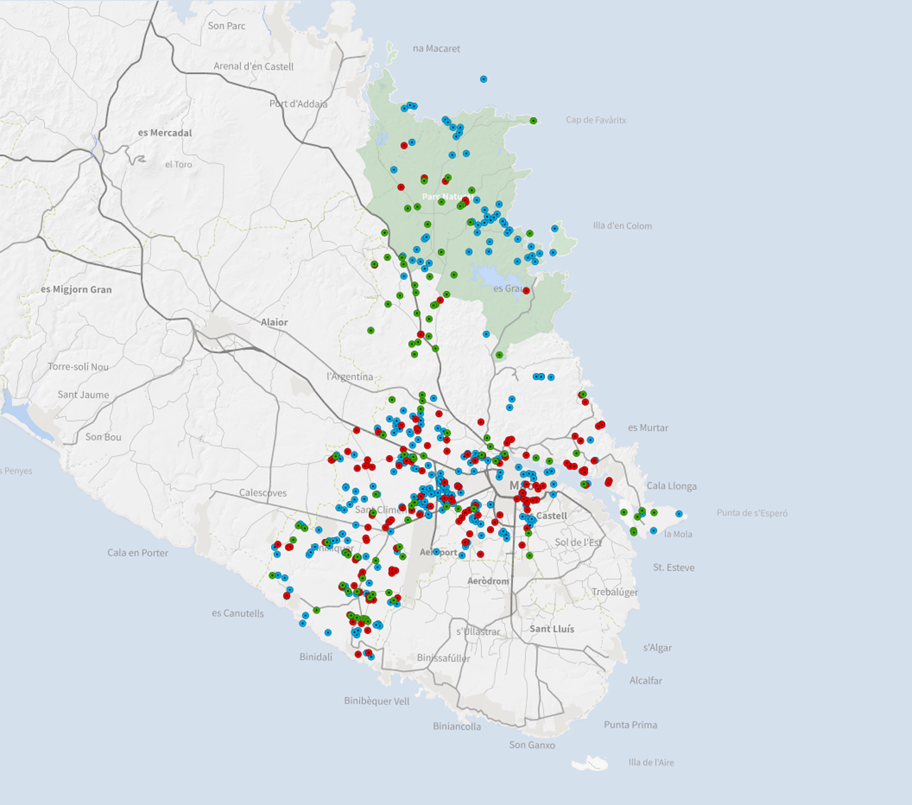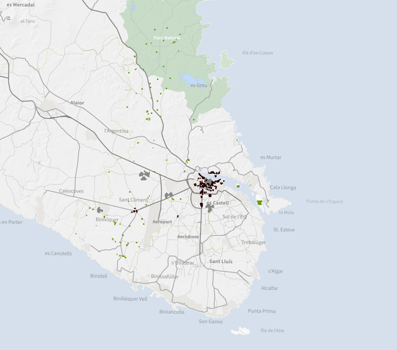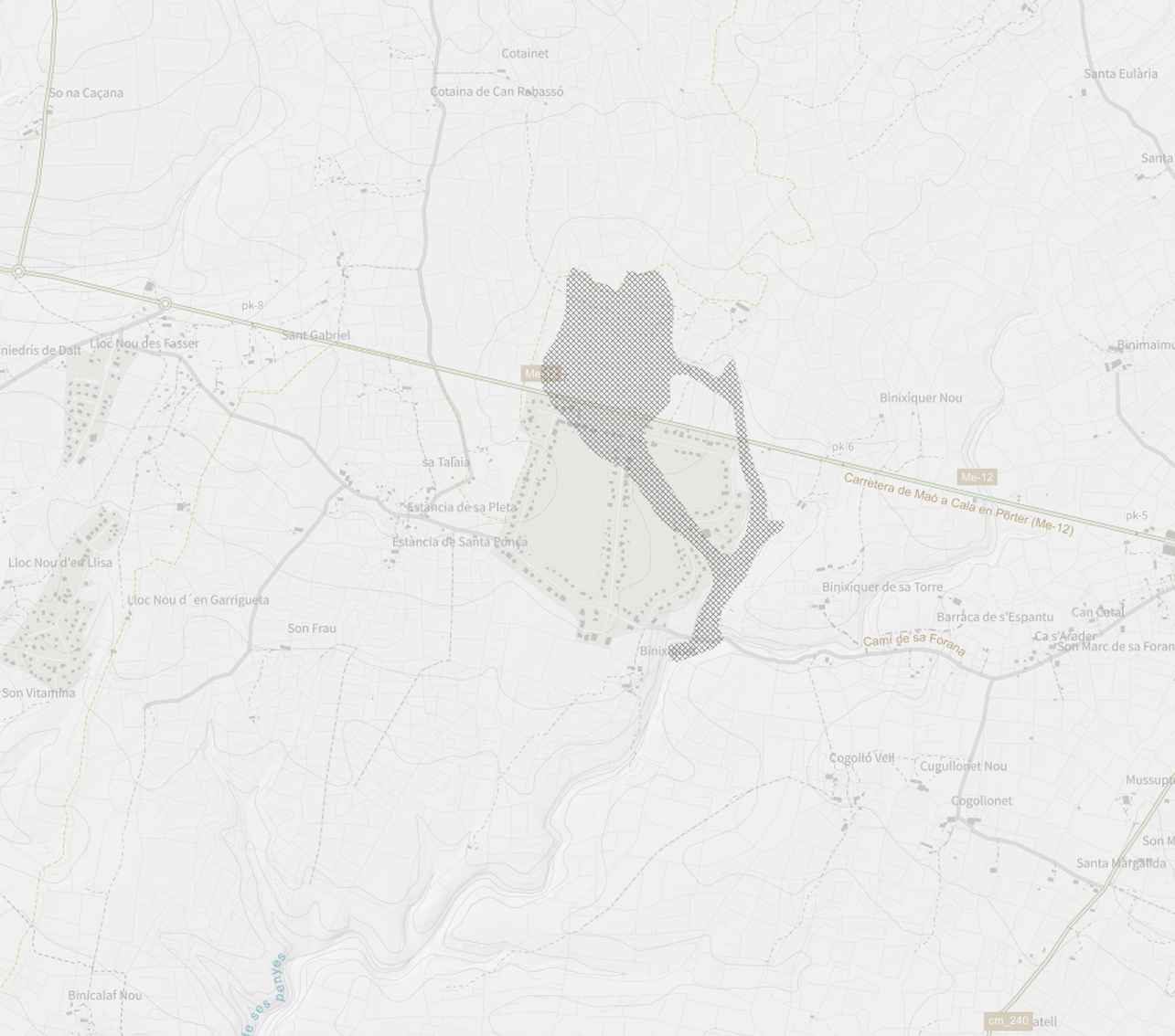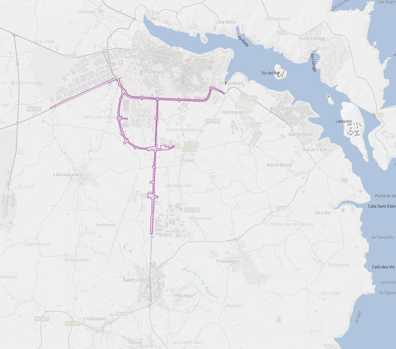 Domini Públic de Carreteres. Aquesta capa correspon a la sèrie "Ordenació en Sòl Urbà" del Pla general d'Ordenació Urbana de Maó. Cada sèrie es representa amb una simbologia diferent.