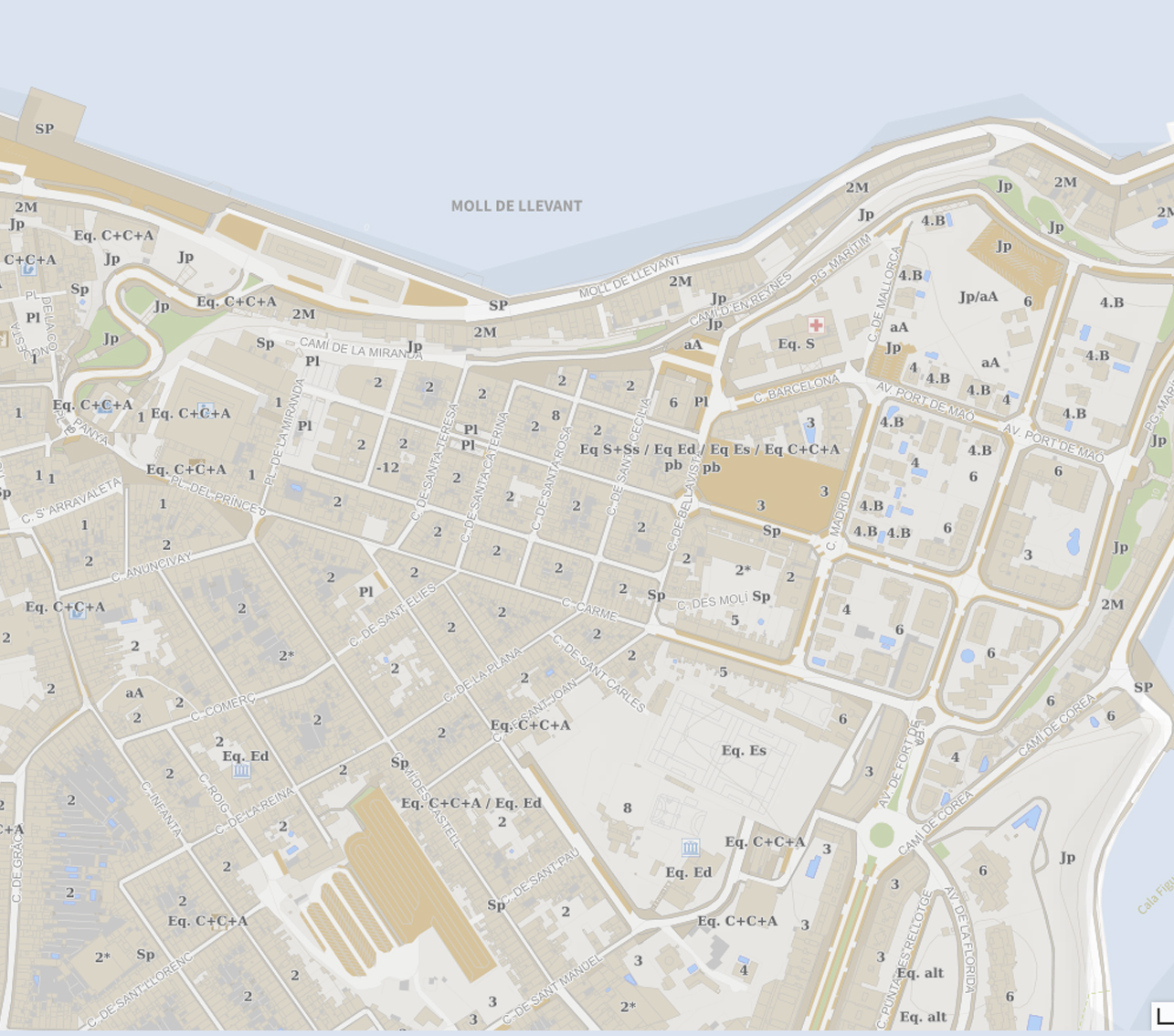 Text de les qualificacions del sòl i altures. Aquesta capa correspon a la sèrie "Ordenació del Sòl Urba i Urbanitzable" del Pla General d'Ordenació Urbana de Maó.